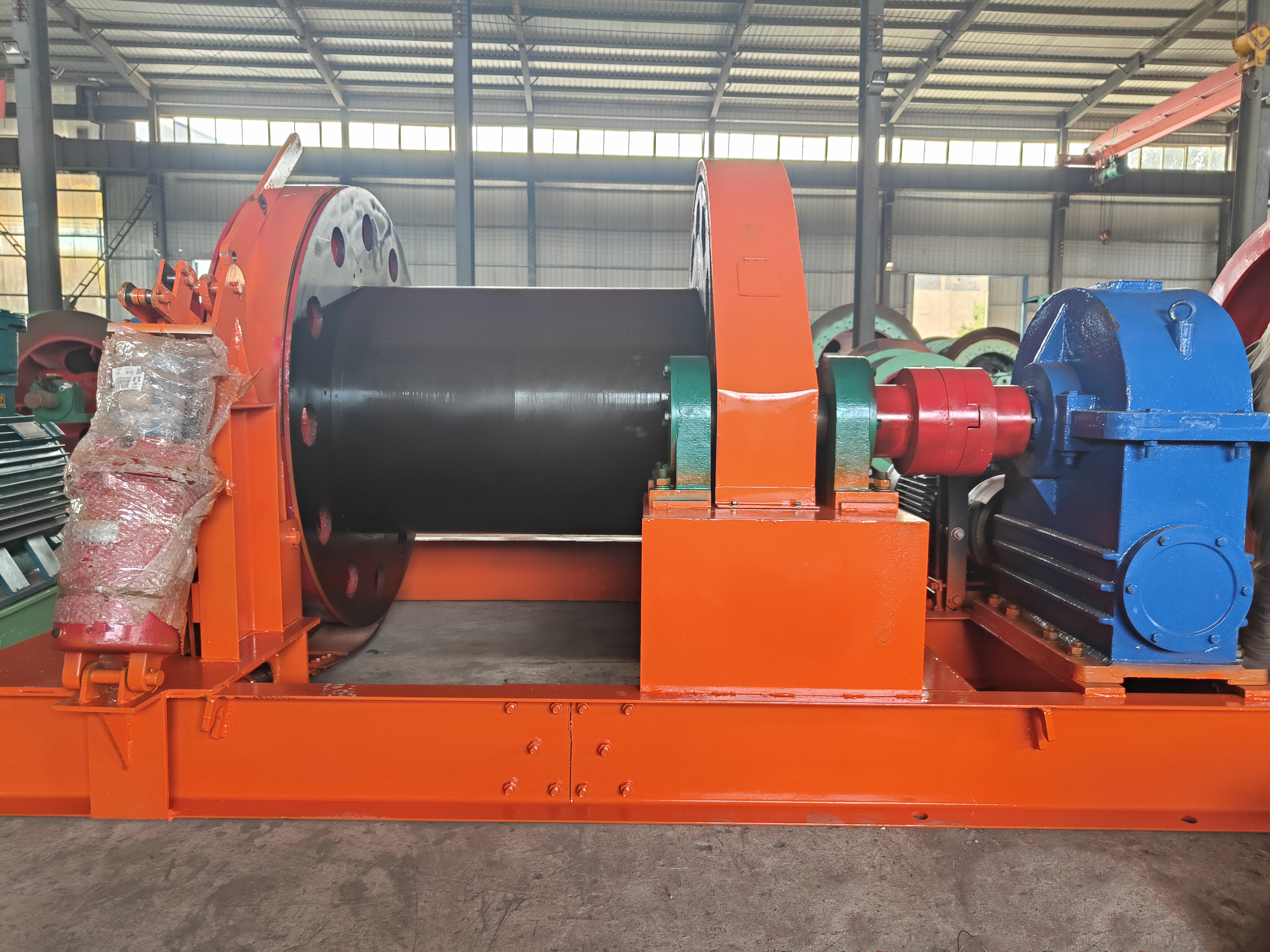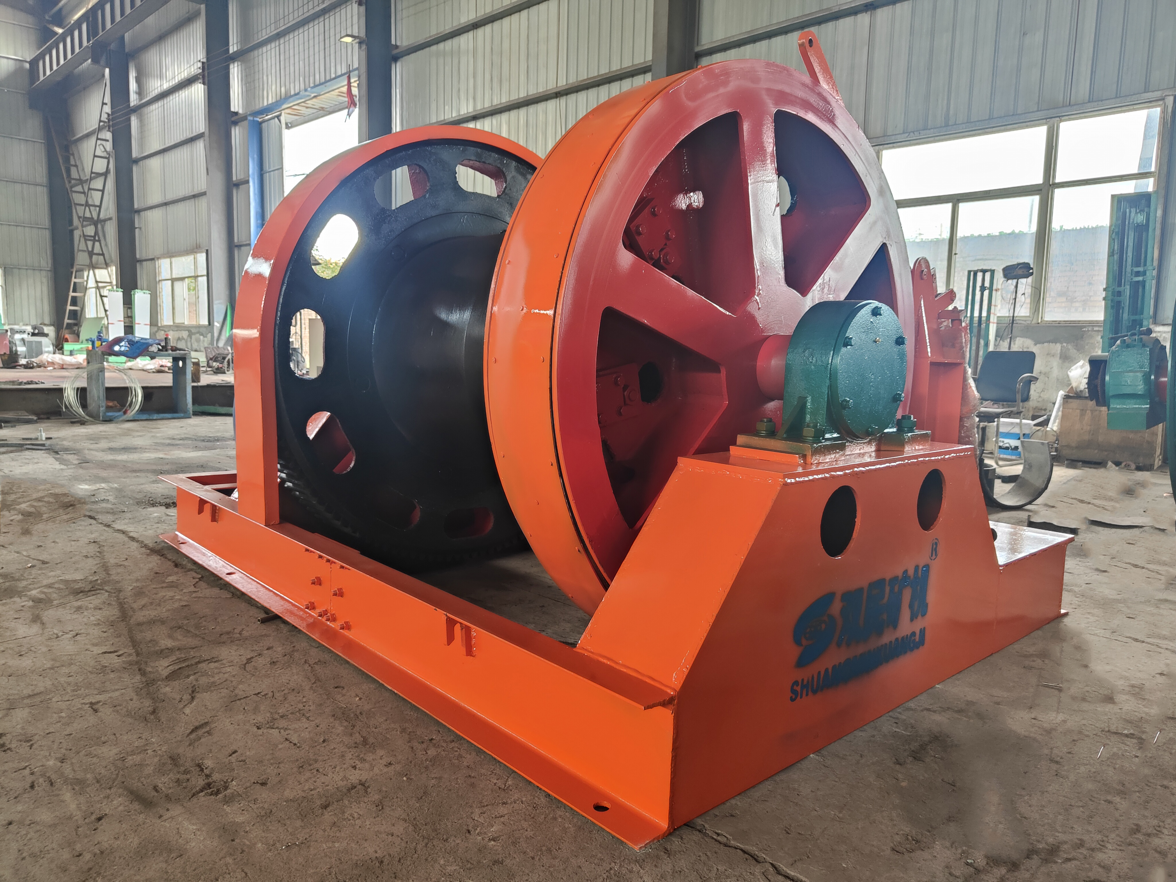 本絞車主要用于煤礦、金屬礦和非金屬礦豎井井筒掘進(jìn)時(shí)懸吊吊盤、水泵、水管、注漿泵、風(fēng)筒等掘進(jìn)設(shè)備和張緊穩(wěn)繩,該絞車系雙鋼絲繩懸吊。將減速機(jī)上的差動(dòng)手把放在差動(dòng)位置,若張緊穩(wěn)繩,可使兩根穩(wěn)繩的張緊力保持相等;若懸吊水管、注漿管、風(fēng)筒等管類設(shè)備,可保證其被懸吊管類設(shè)備與地面保持垂直的狀態(tài)。如果懸吊吊盤等盤狀設(shè)備,需將其差動(dòng)手把放在直通位置,才能實(shí)現(xiàn)兩繩繩速的一致。