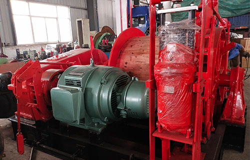 該提升絞車的主軸裝置有固定卷筒、活動卷筒(僅雙筒用)主軸、兩個軸承座、調繩機構(僅雙筒用)等部分組成,用來纏繞或釋放鋼絲繩。單筒提升絞車鋼絲繩為上出繩,雙筒提升絞車活動卷筒為下出繩,固定卷筒為上出繩,卷筒上裝有襯木。