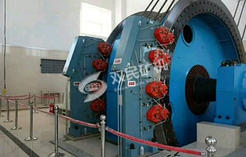JKMD型多繩摩擦式提升機(jī)采用低速電動(dòng)機(jī)時(shí)可不用減速器,電動(dòng)機(jī)直接與卷筒主軸相連,或?qū)㈦妱?dòng)機(jī)轉(zhuǎn)子裝在卷筒主軸的末端。傳動(dòng)功率大時(shí),可采用2臺(tái)或4臺(tái)電動(dòng)機(jī)同時(shí)驅(qū)動(dòng)。一臺(tái)提升機(jī)的總功率已達(dá)到11600千瓦。制動(dòng)系統(tǒng)是保證提升機(jī)安全運(yùn)行的重要裝置。遇緊急情況時(shí),制動(dòng)系統(tǒng)應(yīng)通過(guò)可調(diào)節(jié)制動(dòng)力矩的液壓系統(tǒng)產(chǎn)生兩級(jí)安全制動(dòng),以保證提升機(jī)及時(shí)停車又不生產(chǎn)制動(dòng)過(guò)猛現(xiàn)象。交流電動(dòng)機(jī)驅(qū)動(dòng)的提升機(jī)。其制動(dòng)系統(tǒng)還要具有靈敏的制動(dòng)力矩可能性能,以準(zhǔn)確控制提升機(jī)在臨近通車點(diǎn)時(shí)的運(yùn)行速度。
