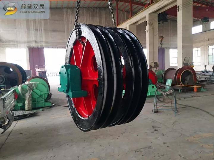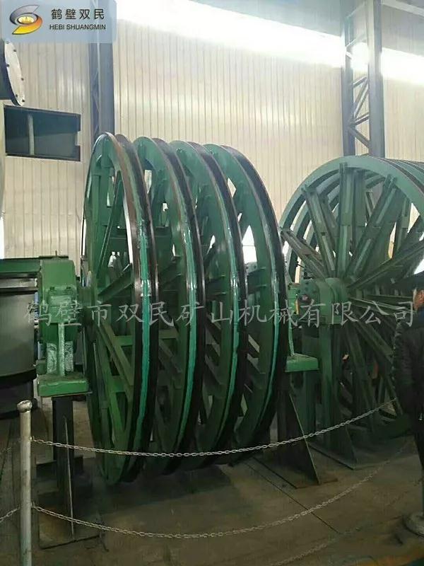 天輪由軸、天輪、滾動(dòng)軸承、軸承座等組成, 一個(gè)天輪固定在軸上,稱為固定天輪,其余天輪其輪轂內(nèi)嵌一個(gè)銅套,活裝在軸上,對軸可作相對轉(zhuǎn)動(dòng),以消除因各條提升鋼絲繩的速度差對天輪的滑動(dòng)摩擦。
